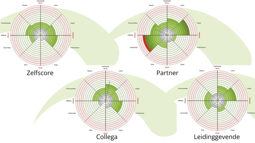De test bestaat uit een snelle, intuïtieve vragenlijst (7 minuten) waarin je antwoord geeft op verschillende stellingen. Tevens kan je de test door 3 anderen OVER jou in laten vullen. Het resultaat geeft per profiel (zelfscore en score anderen) een intensiteitsbeleving weer op de 8 gedragstypes zoals geformuleerd in de Roos van Leary. Zo krijg je in één oogopslag inzichtelijk hoe jij over komt op anderen! De mogelijke verschillen tussen de zelfscore en die door anderen kunnen blinde vlekken en belemmeringen in gedrag weergeven en daarmee vertaald worden naar leerwensen voor effectieve communicatie met impact.